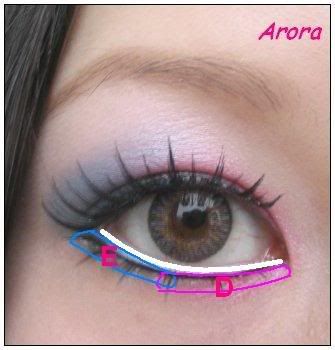 在白线外侧化真正的下眼线,前半用D色,后半用E色。