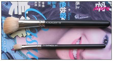 昨天用这块修容高光组合的时候,感觉用MAC#187取高光色有点不舒服,因为刷头太大,抓粉量小,需要叠好几次才能出效果。所以今天对工具做了一些变动,依然是#168刷阴影,高光改为用MAC#217眼部晕染刷来上。#217刷头大小适中,刷毛略有韧性,抓粉力很好,打高光非常的得心应手,建议手里有这把刷子的jm可以尝试下拿它作这个用途哦。