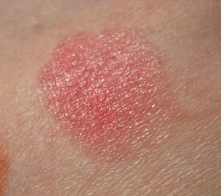 质地水润,擦到脸上不会粘粘的,很容易推开。上脸效果完全不会像实物这样艳,是淡淡的红润,阳光下能看到细微的金闪光泽。