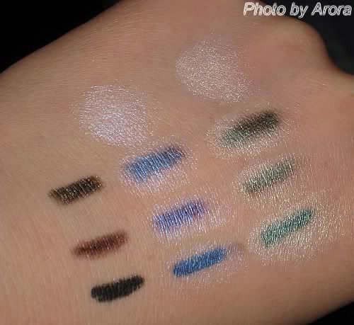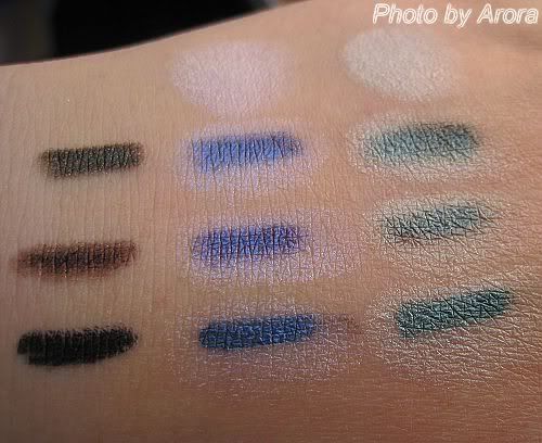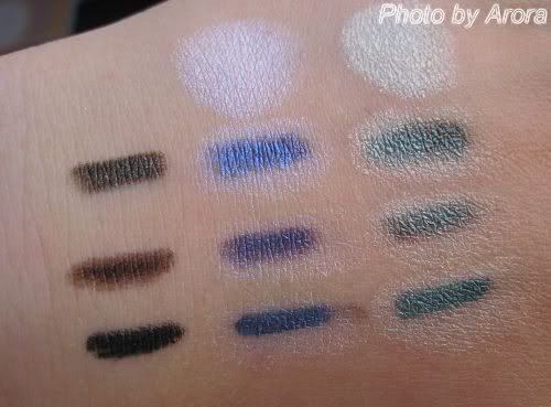 smolder各化三条线,一条是原色,另外两条分别叠iceland的两边。可以看到,原本的眼线色叠过眼影后,分别变成了蓝紫和墨绿,并根据眼线底色的差异略有不同。