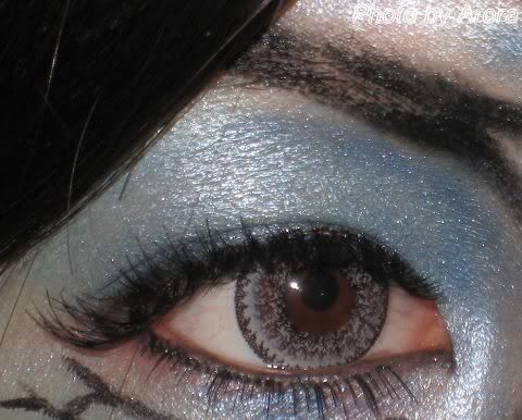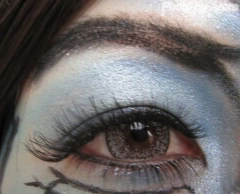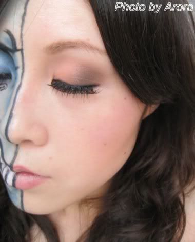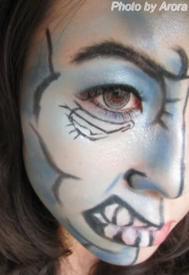 右边脸,用淡蓝色眼影大面积打底,深蓝色做修容制作面部立体感,黑色线条表现皮肤表面的纹路。眼部就是大面积的蓝色加黑色眼线,注意眉毛的毛发感。