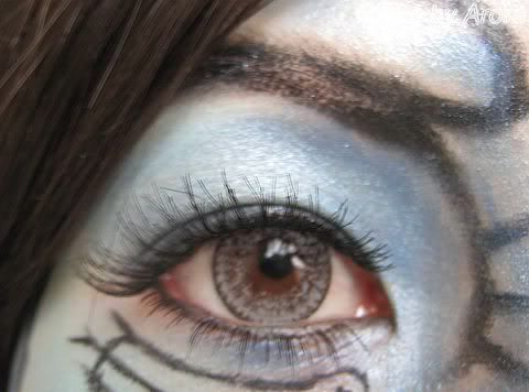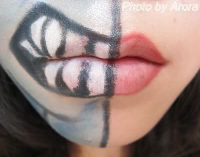 唇部是先用唇膏myth遮住嘴唇底色。MAC黑色眼线笔描出骷髅嘴形状,rimmel白色眼线笔化出牙齿。
