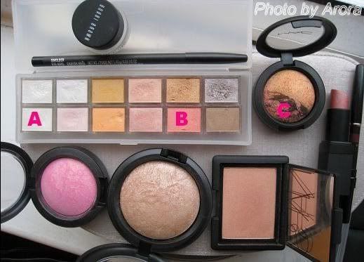 luster腮红打阴影。MAC炫彩饼大面积扫在颧骨和额头增加光泽感。