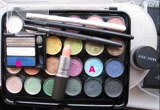 大号刷沾取A色涂满这半边脸,B色按照MAC那张示范图做阴影制作脸部立体感。