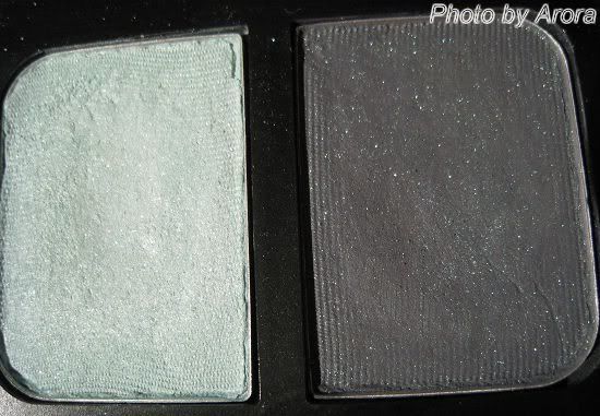 薄荷银蓝绿配银闪紫褐色。NARS最美的双色配色之一,浅色边非常显色,薄薄刷一层就能覆盖眼皮底色。深色紫褐边相对sheer一些,带有大颗闪粉,用来叠眼线或化眼窝很漂亮。