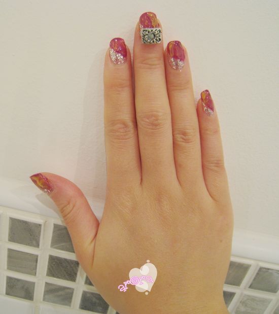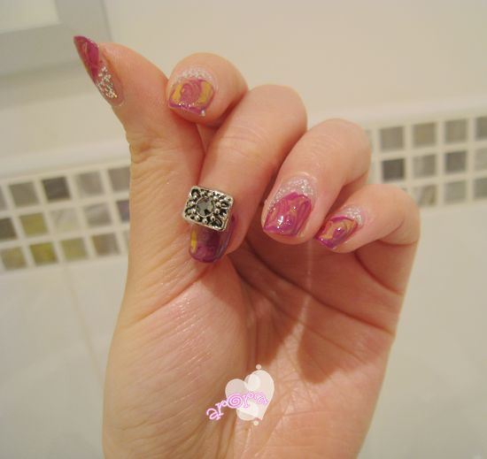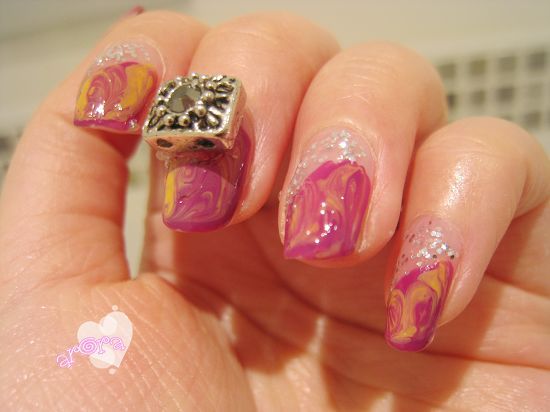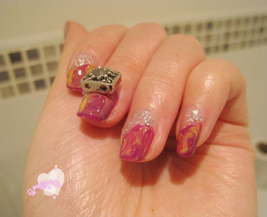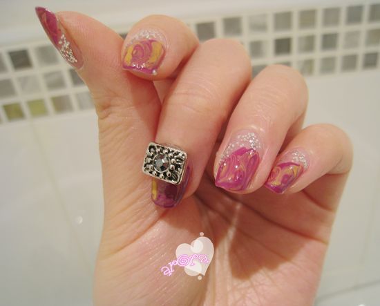 没拍用品图,就是barry m的紫色和黄色油漆色,银色拉线笔,还有大号的指甲饰品。其实正宗的marble nail应该是把甲油滴在碗里面然后画花,这里是简化版本。先涂底油,然后斜涂紫色甲油,接着滴2小滴黄色在上面,用橘木棒在指甲表面随意的搅几下制造出大理石图案。甲面空白位置用拉线笔点上银色亮片。最后擦一层亮油。中指指根加了个饰品,增加点华丽感。