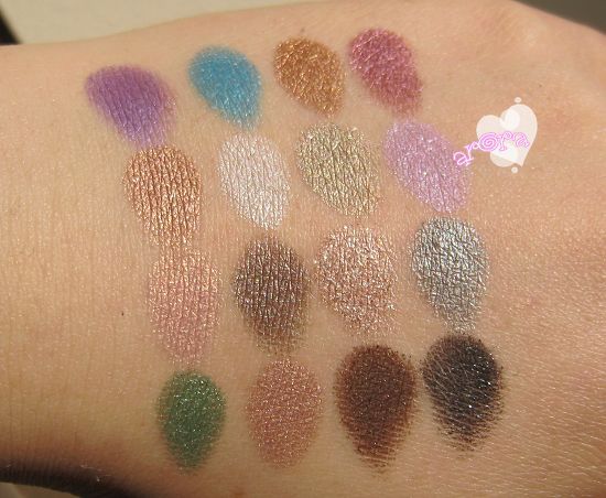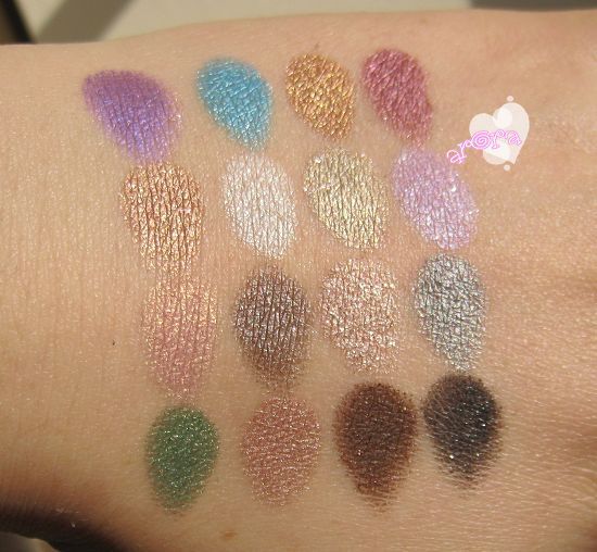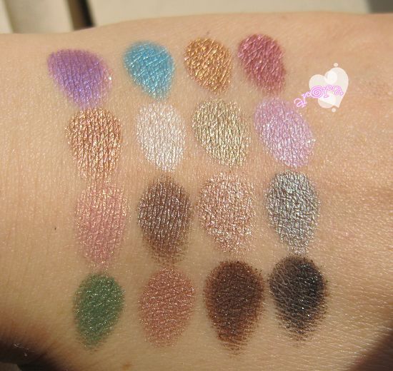 整体看一下,闪闪亮,很美丽,跳跃色也有,日常大地色也有,烟熏色也有,不失为一个实用又好玩的盘子。显色度延续了UD眼影书的优良传统,非常饱和。