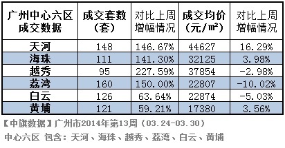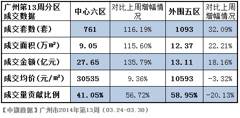 2、2014年第13周广州市中心六区与外围五区成交量变化情况