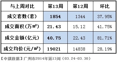 据广州中旗地产数据平台监测,2014年第13周广州全市一手住宅共成交1854套,环比上涨37.95%;成交面积21.43万平方米,环比上涨41.75%;成交总额为40.75亿元,环比暴涨81.71%;成交均价为19021元/平方米,环比上涨28.19%,是今年以来的第二高位(今年最高成交均价是第5周的20824元/平方米)。