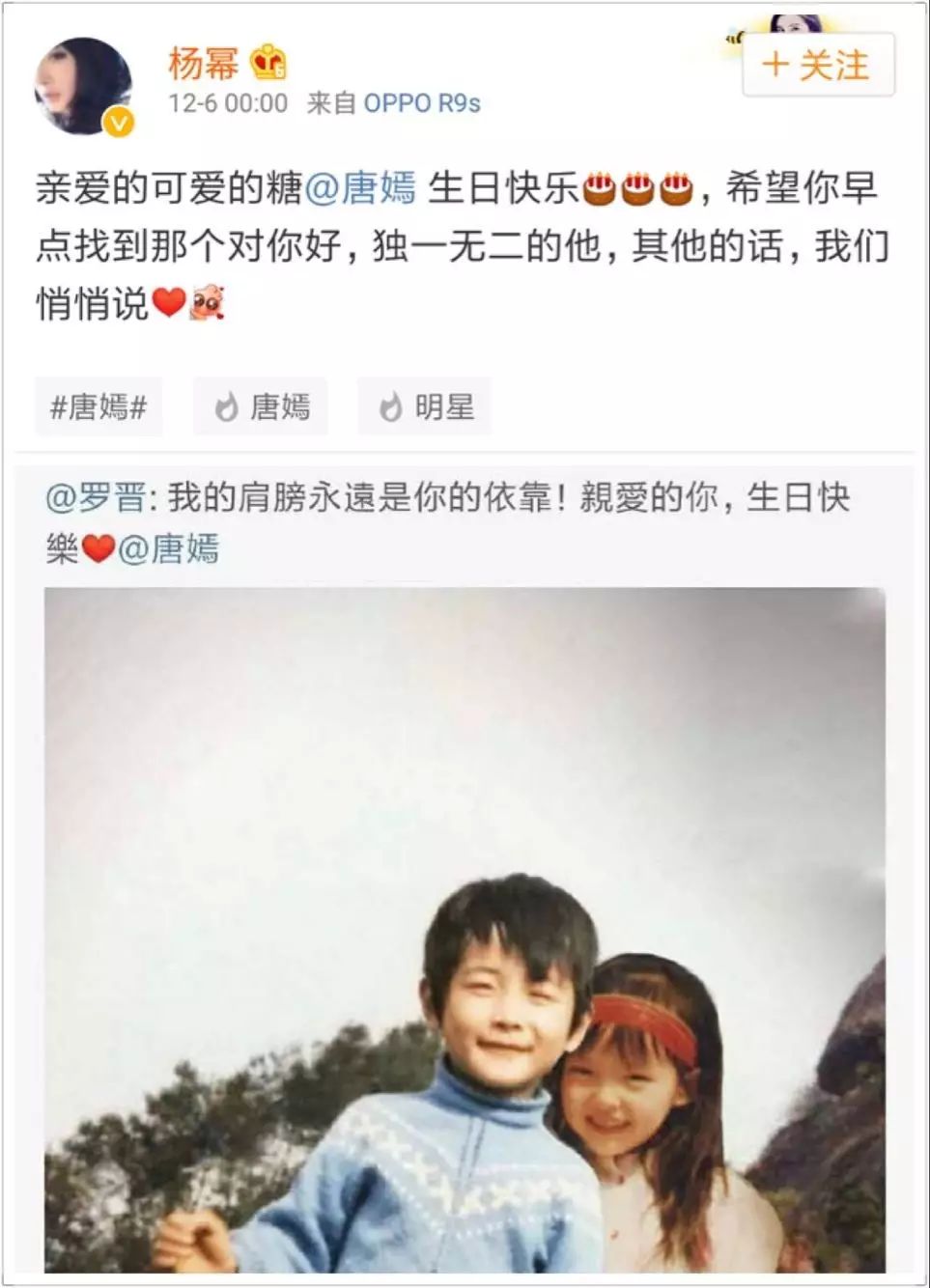 对比唐嫣,杨幂处理二人的闺密关系就稍微显得有点儿不那么走心了哟~在唐嫣生日当天,大幂幂很准时的发了条微博,祝福糖糖生日快乐,早日找到另一半,好吧,这个微博很甜蜜~很温馨~闺密之情溢于言表,but!不久之后罗晋就发微博与糖糖秀恩爱了,这让祝福闺密早日脱单的大幂幂hin!尴!尬!啊,心疼大幂幂三秒钟。