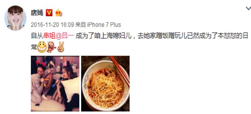 唐嫣吕一,比起和杨幂的闺蜜情,感觉唐嫣和吕一的感情更好一些,两人相识于2013年后关系相当亲密,经常在家聚餐,在家玩嗨,一起看《锦绣未央》,吕一偶尔还会在微博上调侃糖糖,唐嫣第一时间互动互动,亲切称呼她串姐。唐嫣和杨幂则是在何以笙箫默后互动越来越少。