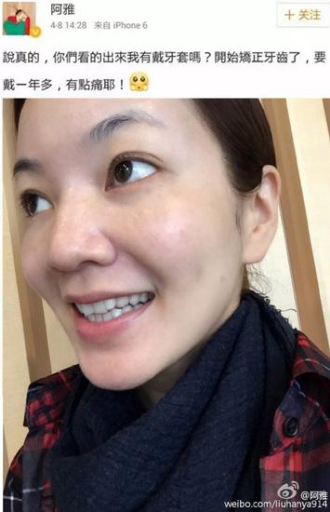 台湾女星阿雅和伊能静也在做隐形矫正。明星也不太避讳谈及整牙,反而和大部分“牙套宝宝”一样,她们也乐于在微博上跟网友们分享整牙心得。
