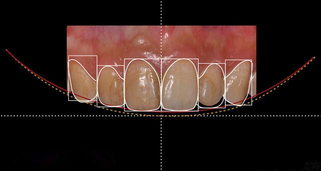 下唇上部边缘构成微笑线,并与上牙切缘平行,微笑时轻接触。此外,微笑时,上下唇缘间的空间中75%至100%位置应由上前牙占据。