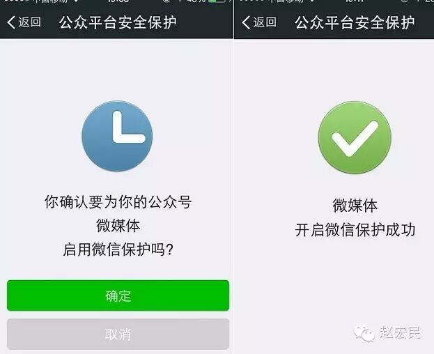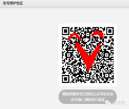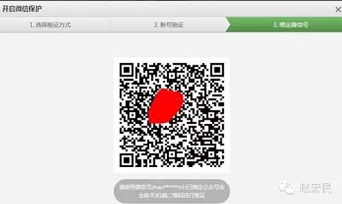 扫描该二维码后,手机端提示,“确认要为公众号xxx启动微信保护吗?”。至此, 成功绑定微信号。