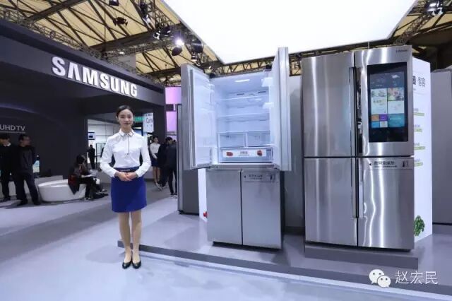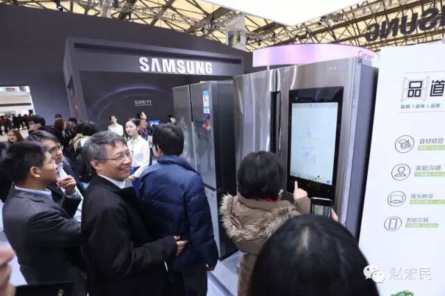 3月9日,宏民来到中国家电及消费电子博览会(AWE)现场,在三星展台,就看到一台智能化、互联网化的“物件”-三星品道智宴冰箱,看图。