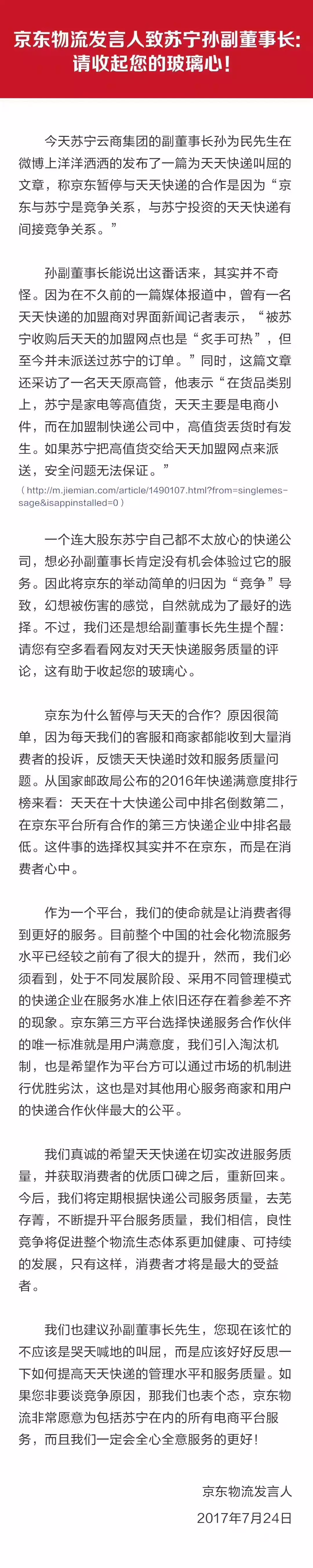 其实,快递员节这件事有一个很大铺垫,从7月底开始,京东与苏宁互怼两三个来回了,在整个电商界特别是物流领域引起轩然大波。这一切开始自京东对“对综合服务质量较差,违反平台规则”天天快递进行停用处理。