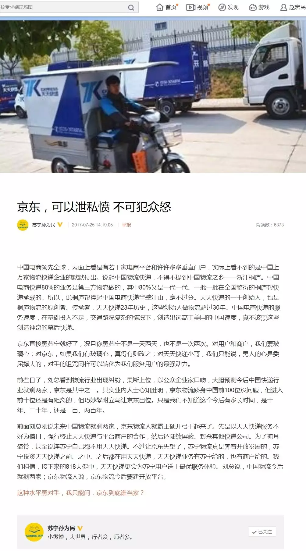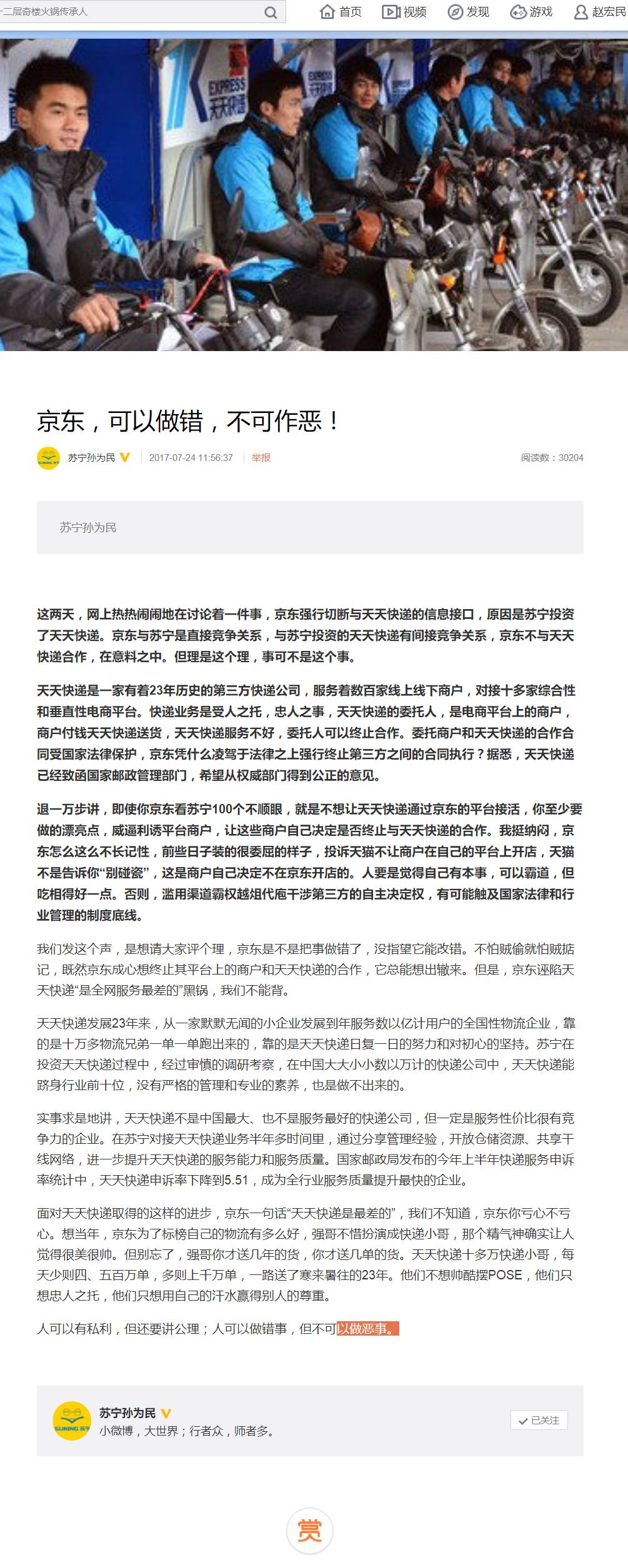 苏宁副董事长孙为民随即就来了一封檄文《京东,可以做错,不可作恶!》