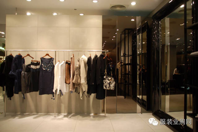 Kang jin young在试衣间的位置,装配了一面巨大的落地墙镜,除了顾客观看穿着效果之用,更大大拓宽了顾客视野,增加了店铺的空间感和纵深感。墙壁的直线条,充满了建筑感,反映着Kangjin young的设计理念之一——建筑。在货杆的一端,以品类交叉的思维陈列了一款皮包,非常方便顾客主动试穿,便于与就近的货品进行搭配试镜。整杆产品呈现均衡原则,白色为代表的亮色产品位于货杆的右黄金点,两侧的深色产品均衡呼应,是典型的黄金分割视觉效果。每种不足,产品下摆过于平齐,显得品类枯燥、线条平直。