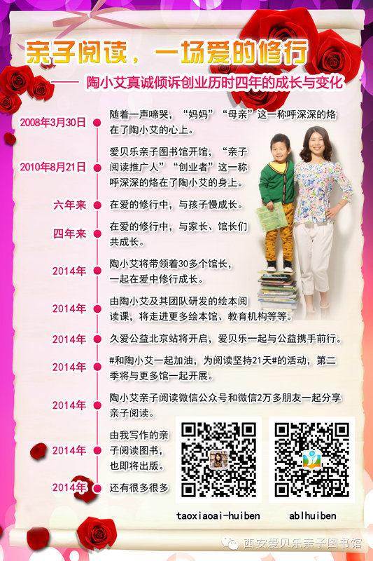 2013年12月3日爱贝乐创始人陶小艾女士发起的“和陶小艾一起加油,为阅读坚持21天”活动吸引了全国各地众多家庭的参与,让更多的家长和孩子享受到了亲子共读的乐趣。