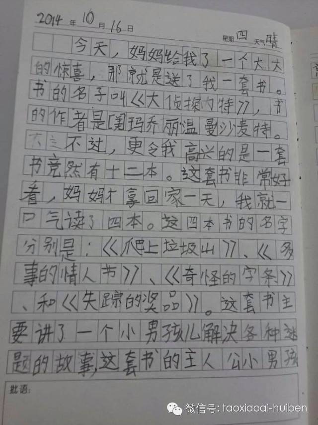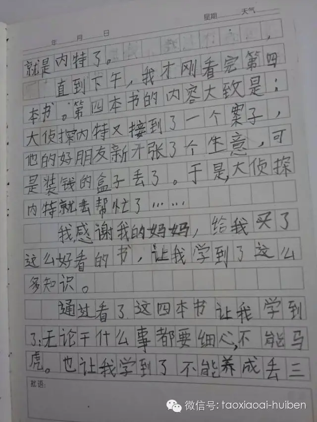 同时,这篇作文在我的朋友圈引起了大家极大的称赞和评论,感谢这位妈妈从小把阅读这位朋友给了孩子。大家可以回复汉字“大侦探内特”来了解这套书的团购信息。让我们一起来看看这位小朋友的作文哟。