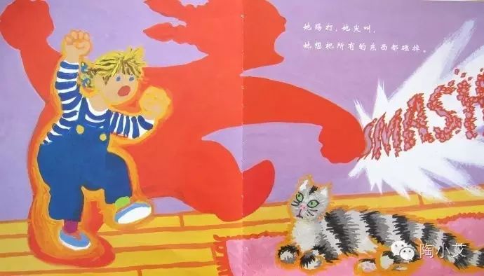 我们来看看这本我特别喜欢的《菲菲生气了——非常、非常的生气》绘本中的菲菲。读这本绘本时,我家孩子还很小,只有两岁多,但他也会有各种情绪,比如不开心时会大哭,比如某些东西不让他碰时会不高兴。第一次读完这本书时,我就特别想把这本书送给家长们看看,虽然画面没有多少文字,虽然故事情节特别简单,但是真是一本让家长警醒的书。当菲菲玩得正高兴时,一句“该我玩了”,她的姐姐一把抓住了大猩猩,菲菲说“不行”,但是妈妈说:“行,菲菲,是该她玩了。”姐姐用力夺走了大猩猩,菲菲跌倒在大卡车上。哼!这下菲菲可气极了。生气的菲菲会做什么呢?她像所有的孩子一样,踢打,尖叫,想要把所有的东西砸掉。你的身边一定会有很多菲菲,但是你一定很少见过菲菲那样的父母。他们并没有阻碍孩子情绪发泄,既没有大声地呵斥孩子,也没有责骂孩子。