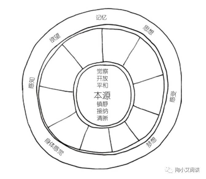 通过“觉知之轮“模型来洞察自我的心理。觉知之轮,顾名思义,是用一个自行车车轮来代表内心。圆心位置是本源,并辐射至外围,外围代表了我们能够注意到或者意识到的任何事物(包括思想和感受、梦想和欲望、记忆、对外界的感知等等)。本源是“执行大脑”的部分,意识驻扎于此,关注外围的各种事物。