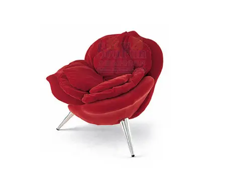 月光花园扶手椅二 与月光花园扶手椅齐名的还有他的玫瑰椅(Rose Chair),该椅子同样设计于1990年。这把椅子就像一把盛放的花朵,一片片花瓣重叠起来的座垫,一看就让人觉得非常舒服。该椅的架构用了金属和木头两种材料,其椅脚为铝制,实际上也是玫瑰花的一部分——玫瑰的刺。整个设计浪漫之中带有高贵的气质。