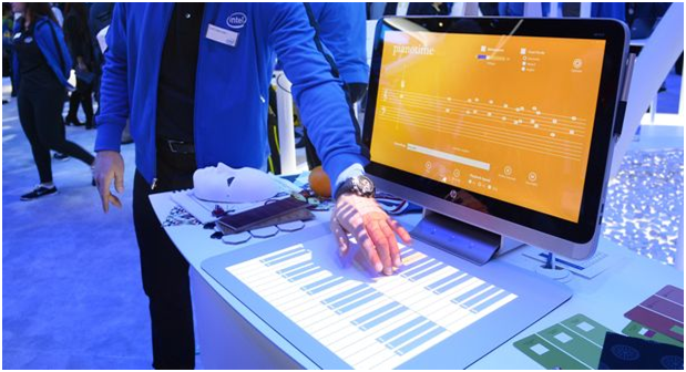 英特尔正在利用实感技术拓展更多的应用场景,这个技术可以扫描人脸,识别人脸的表情并读懂人的情绪,可被利用于开发出人工智能产品。实感技术的摄像头还可以用于识别人体生理特征,科幻电影里的眼球扫描、指纹扫描等都已经成为了现实。更有趣的是实感技术可以把电脑键盘、钢琴键盘虚拟投射到桌面上,用户不需要触碰桌面,只需要在桌面上方动动手指,就可以打字或者弹奏出美妙的音乐。