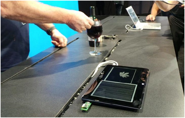 2013年的秋季IDF上,英特尔展出了一款全身被玻璃覆盖类似平板一样的设备,我们称之为“英特尔魔法平板”。“英特尔魔法平板”中嵌着两块电路板和英特尔的处理器,外接一块电子墨水屏。当工作人员把红酒倒入设备中,红酒与电路板接触后,这时候出现了令人惊讶的一幕——设备上的英特尔处理器在红酒的作用下启动了,并且运行了一个图形类程序,在电子墨水屏上显示出来。