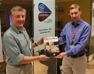 DavidClark(左)在史云顿市将他持有的《电子杂志》原件转交给英特尔的 Nick Knupffer。(2005 年)