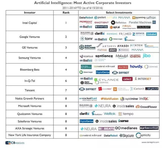 上述两大收购基本补齐了英特尔在人工智能,尤其是机器学习领域的两大短板,同时也进一步延伸了处理器的业务体系。更重要的一个事实则是,英特尔旗下的风险投资也是过去几年人工智能领域的活跃投资机构,下图来自 CBinsights 的统计,这些公司涉及数据、深度学习算法、机器人等等,未来不排除英特尔继续收购更多创业公司。