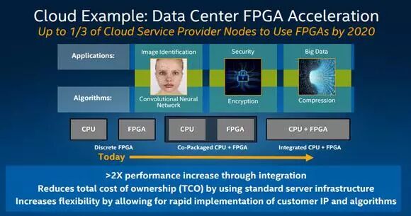 这是英特尔布局机器学习的一个重要战略。具体来说,英特尔会把 FPGAs 和英特尔处理器封装到一颗芯片里,当用 FPGAs 来运算一些机器学习的任务时,比如影像识别算法,这些算法能大大提高它的性能。根据英特尔并购副总裁文德尔·布鲁克斯 2015 年接受采访时的说法,相对于传统的处理器和 FPGA 独立组建,新的一体化芯片最初将带来 30% 至 50% 的性能提升,而最终的性能提升将达到 2 到 3 倍。