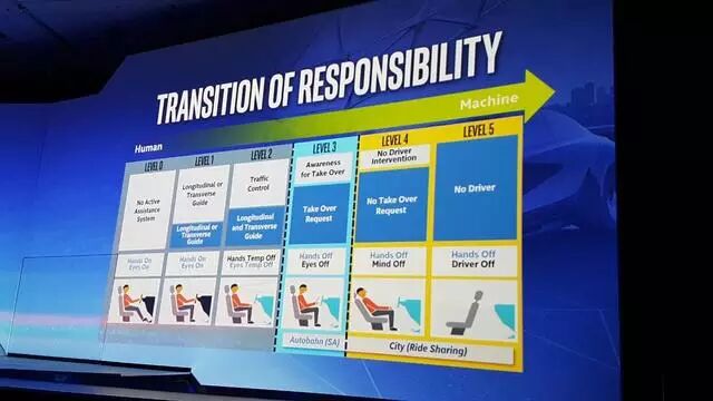 无人驾驶则是另一个人机交互的重要领域,也是最难的一个领域。2016 年 7月,英特尔宣布与宝马、汽车传感器厂商 MobileEye 合作发展无人驾驶汽车,此次 IDF 大会,英特尔展现了对人与汽车交互的观察,目前业界所言的「无人驾驶」还停留在部分自动驾驶阶段,也就是下图的第二级别,到了第三级则意味着司机可以解放手和眼睛。第四级时,司机和乘客可以在车里睡觉,第五级才能实现真正意义的「无人驾驶」。
