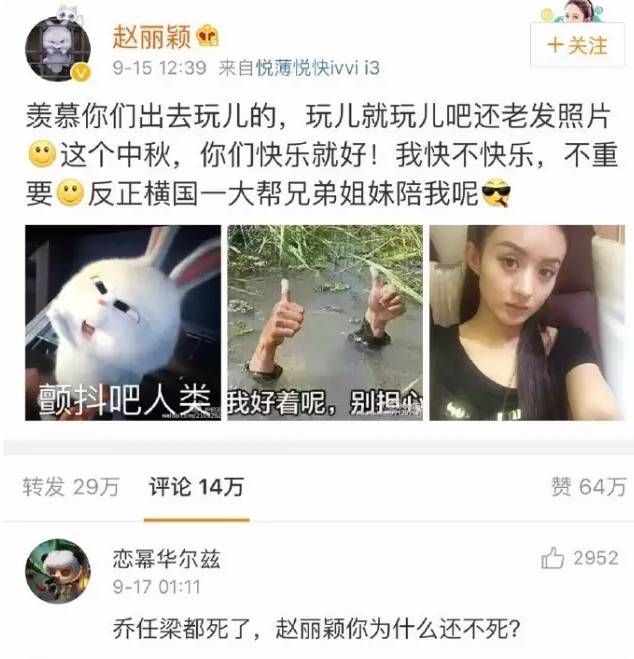 在最近上映的电影《我们的十年》中,赵丽颖和乔任梁分别担当了男女主角,两人在此前也曾经多次合作。噩耗传来,赵丽颖并没有在第一时间表达哀思,于是在她9月15日的一条微博下面,就接到了如此的留言。