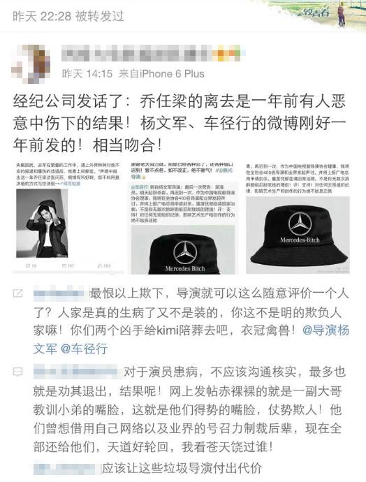 从这条微博中,我们不难看出“经纪公司”将乔任梁的死因归结为了“杨文军,车径行两位导演”的“恶意中伤”。这究竟是怎样的一回事呢?