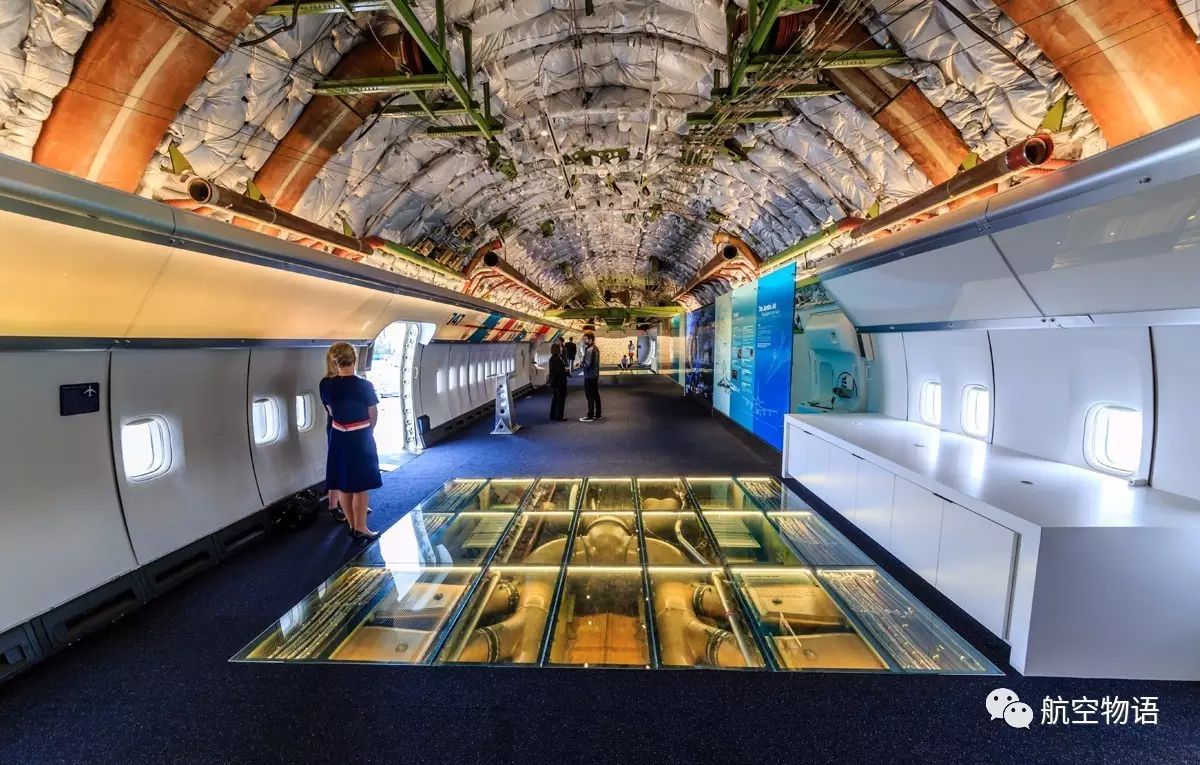 飞机的后半部分客舱则完全改变了模样。在那里,原本温馨的内饰被拆掉,露出了复杂的管线和机体结构,向人们科普航空的精妙;地板也开辟出两块覆盖着承重玻璃的观察窗,揭示货舱和油箱等平时隐藏在乘客脚底的秘密。