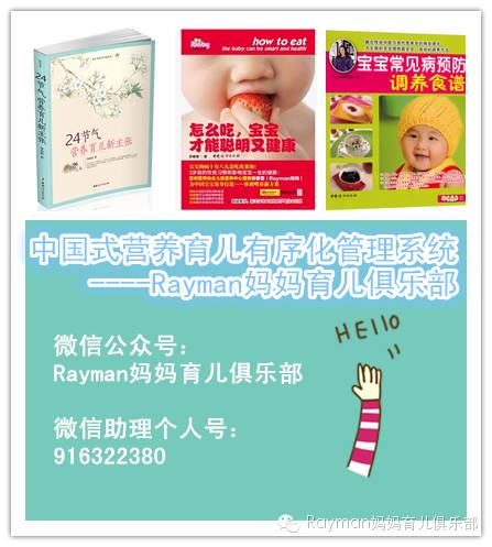 Rayman妈妈,国际注册营养师,国家二级心理咨询师。Rayman妈妈育儿俱乐部创始人,多家全国性儿童营养机构、育儿杂志和媒体的特约营养专家,著有《宝宝常见病调养食谱》、《怎么吃,宝宝才能健康又聪明》《24节气营养育儿新主张》等畅销书,微信公众号“Rayman妈妈育儿俱乐部”将根据节气、地域、个体差异情况定期推送中国式育儿有序化管理系统相关内容,以日常生活中适合、适用、适度、适时的“四适原则”,同时配合众多线下课程和婴幼儿个体饮食调整监测方案,与您一起提高营养育儿品质,欢迎关注!