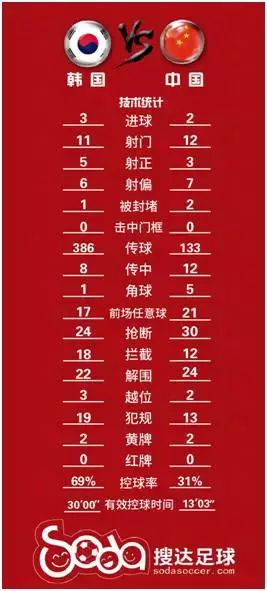 整场比赛,韩国队基本控制了前70分钟,数据统计可以看出,射门次数韩国10比6占优,控球率中国队在前70分钟内只在上半场尾声有短暂的5分钟超过50%。高洪波制定的后发制人战术由于在比赛第66分钟已经三球落后,剩下的20多分钟已经很难做到扳回比分。不过通过换人调整后,中国队将阵型前压还是控制了该时段的比赛,6比1的射门和超过70%的控球率说明国足还是有能力在短时间内对韩国进行前场压制。