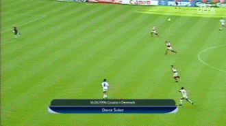 当克罗地亚中场阿萨诺维奇在后场送出一脚精准的对角线长传时,丹麦门神舒梅切尔已开始快速后退,身处前场左侧的达沃·苏克用右脚轻巧地将球卸下并顺势往前一领,接着苏克又触了一次球,进入了丹麦队的禁区。当丹麦后防球员渐渐靠近苏克时,舒梅切尔已在小禁区外站好位置,这时,苏克用左脚将球搓了起来。