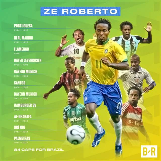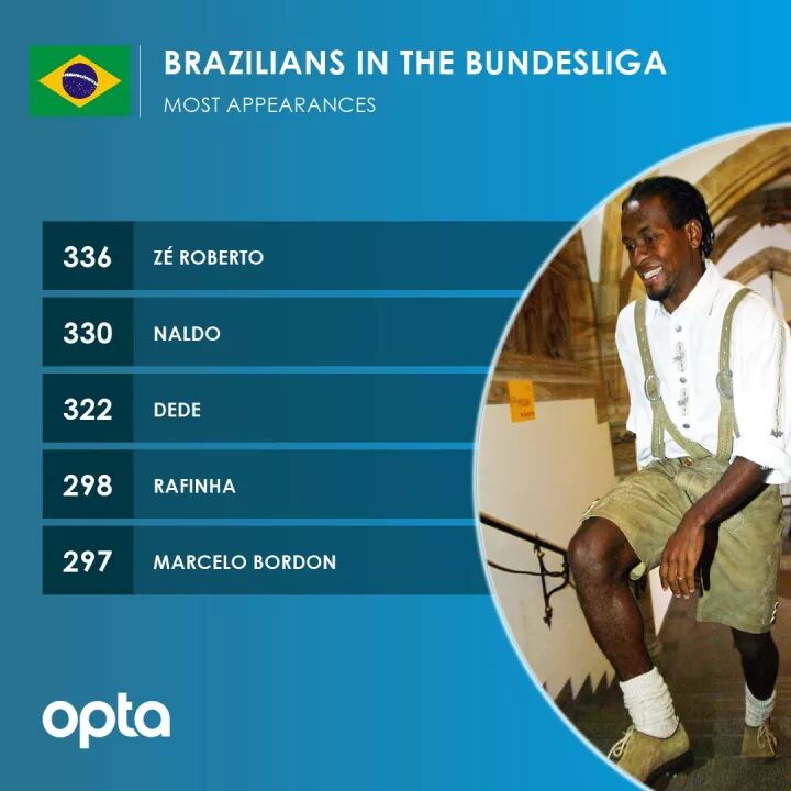 在勒沃库森、拜仁慕尼黑、汉堡,泽罗伯托一共在德甲出场336,至今仍是德甲历史上出场次数最多的巴西球员。