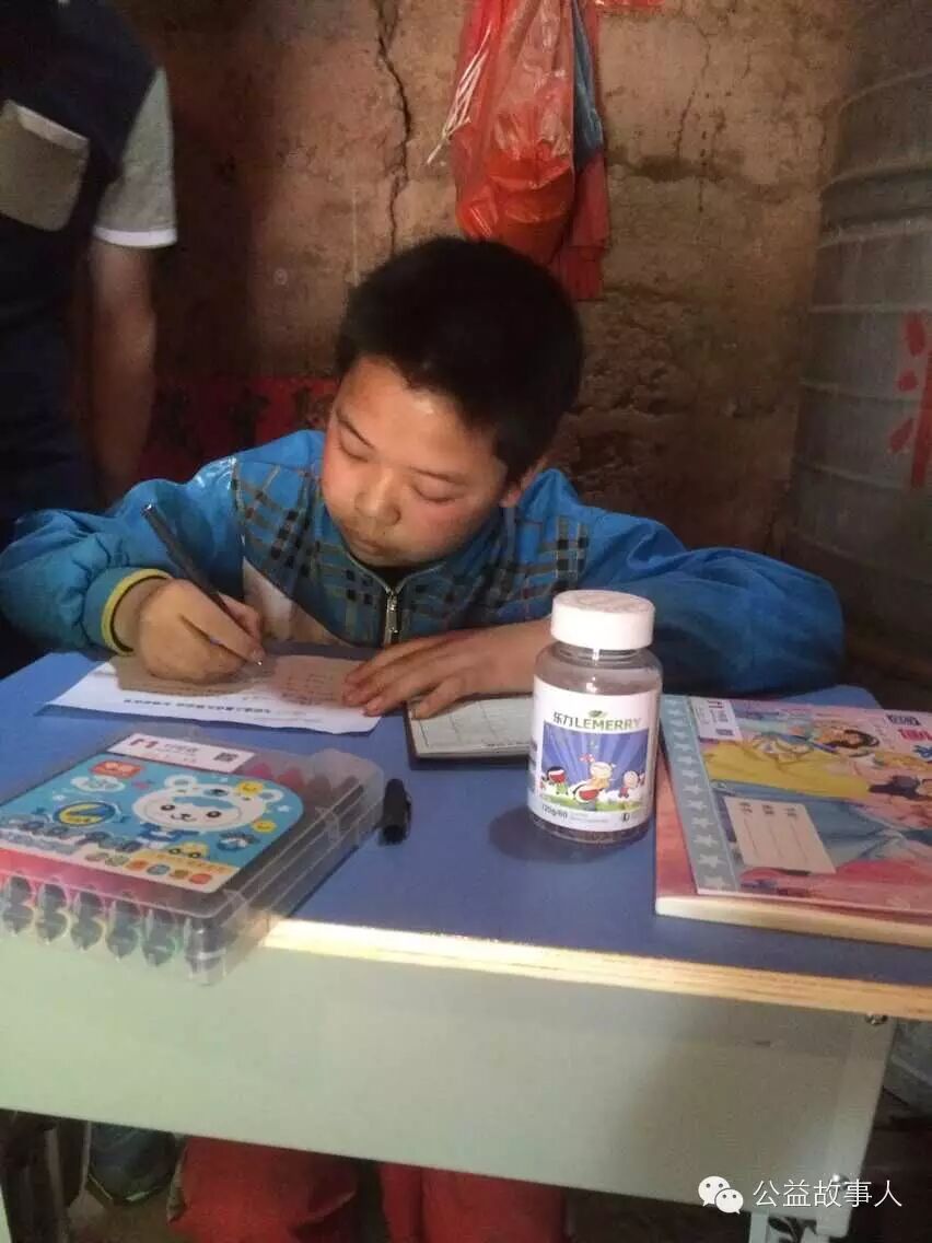 袁洪欢是平桥乡小学六年级的学生,今年12岁。08年爸爸因为直肠癌去世,09年妈妈因乳腺癌去世,姐姐22岁患有先天性心脏病。他就跟着80岁的爷爷奶奶一起生活。一进她家的家门觉得伸手不见五指,开了电灯也暗的要命。黑乎乎的房子,袁洪欢平时就在吃饭的桌子上做作业,熊爸爸调整好适合袁洪欢的高度,把桌子安装好,搬到袁洪欢指定的地方,以后袁洪欢就不用在饭桌上写作业了。