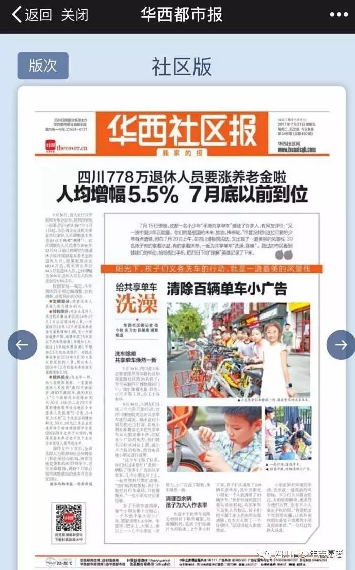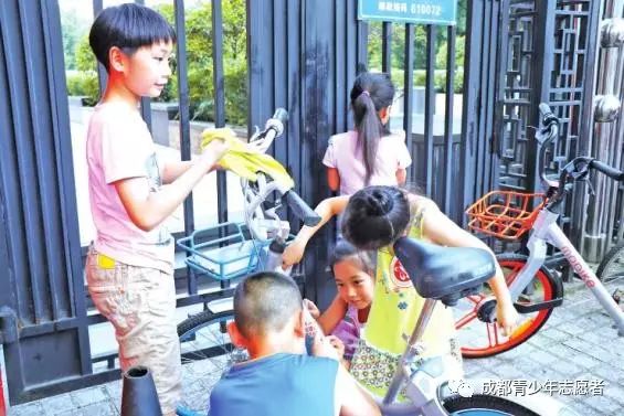 7月15日傍晚,成都一名小少年“手撕共享单车”感动了许多人,有网友评价:“又一波中国少年正能量。你们就是祖国的未来,加油,棒棒哒。”尽管没找到这位可爱的少年有点遗憾,但在7月20日上午,在四川博物院周边,又出现了一道美丽的风景线:39名孩子有的拿着水盆,有的拿着抹布,一起为共享单车“洗澡、除癣”。路过的市民看到娃娃们的举动,纷纷掏出手机,把烈日下的“除癣”英雄记录了下来。
