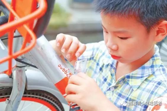 “这个车上贴了好多,你们快过来帮忙!”看到一辆贴了很多小广告的共享单车,几个小朋友冲上去,一起用塑料尺帮忙清理。“他们贴的胶很粘,我们不能把自行车刮坏,只能慢慢来。”一位小朋友对记者说道。
