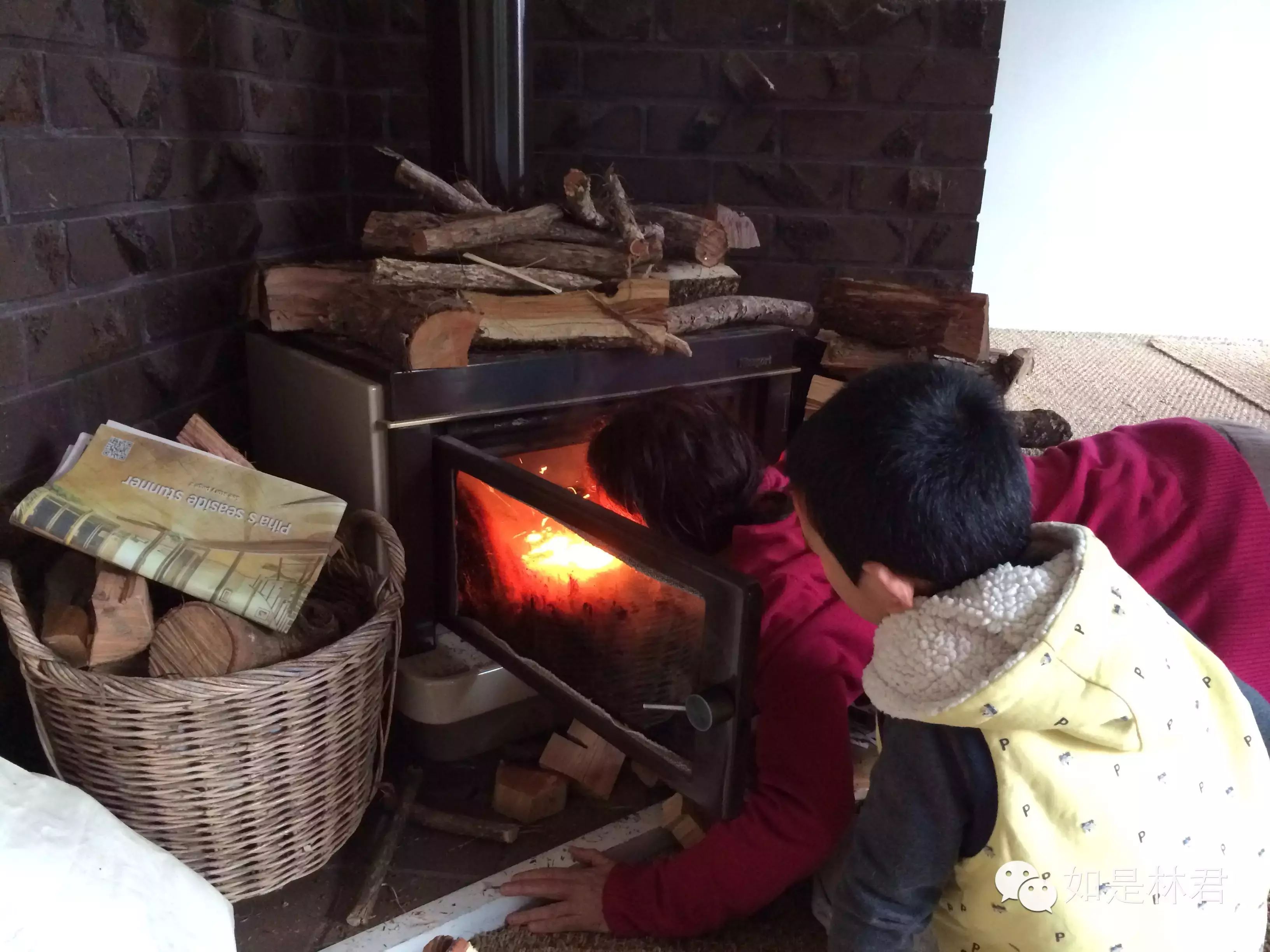 报纸、manuka助燃植物、木材,带儿子生火炉,教他如何往火下吹气助燃,放进木材时她常常会闻闻木材的味道,很享受的样子,全然地活在当下。