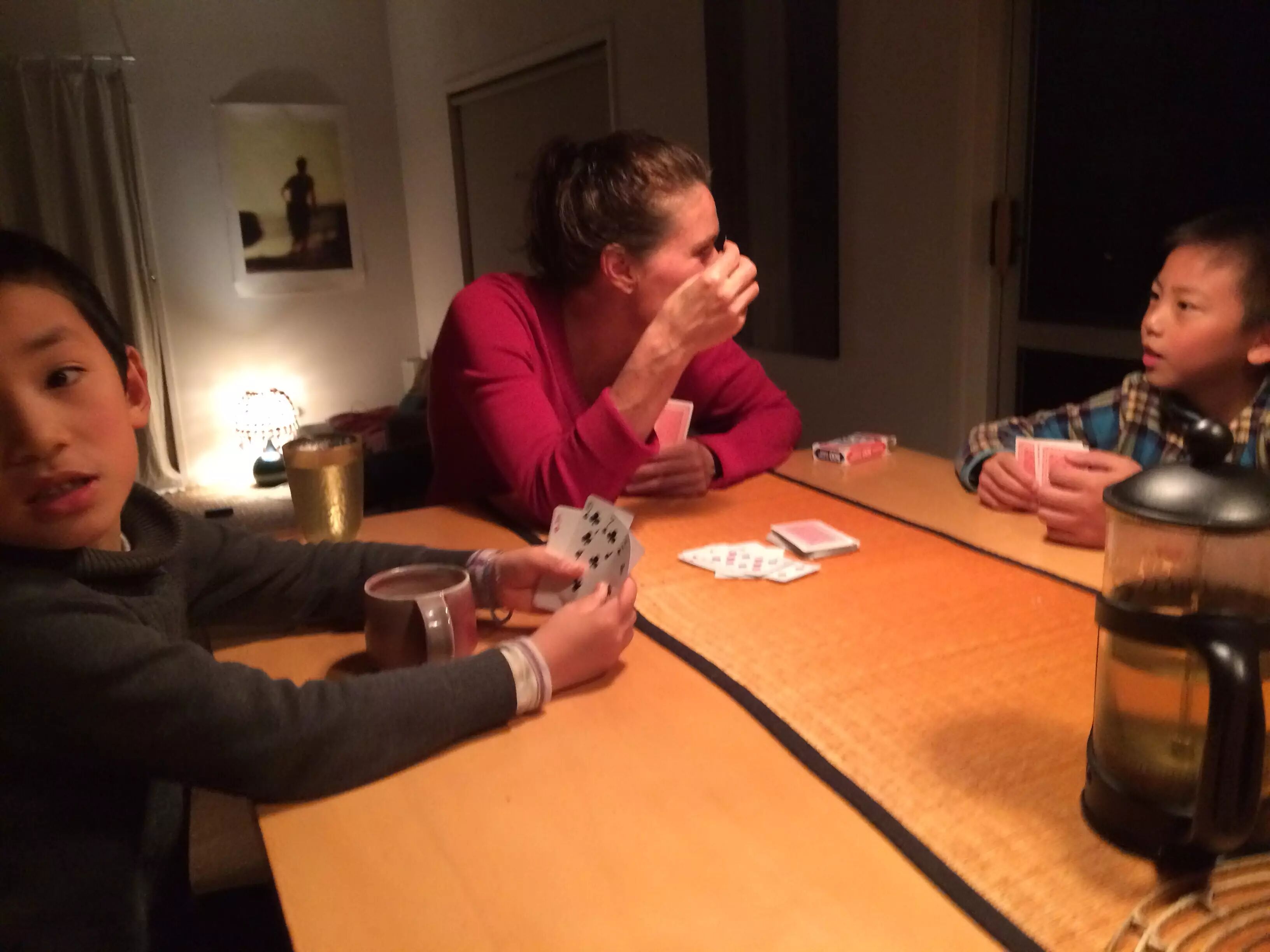晚上,Jaqs借由教孩子打桥牌,顺便教他们英语。后来我和思捷爸爸也加入了他们的行列,看着两个孩子对英语的敏感度很不够,我和思捷爸爸在一旁看着着急,忍不住会从旁提醒,Jaqs两次发出的“oh, Chinese parents!”的感叹让我们再次开始反省我们对待孩子的教育。