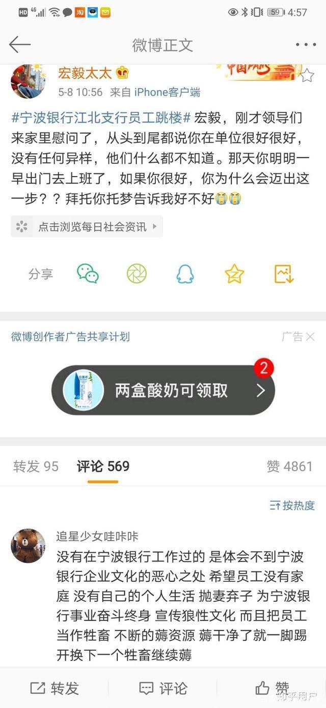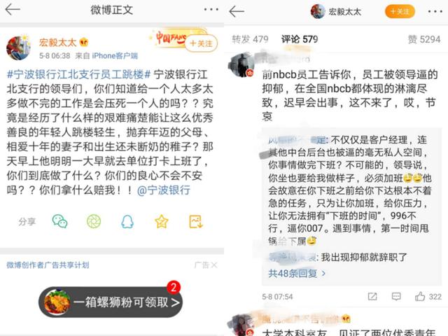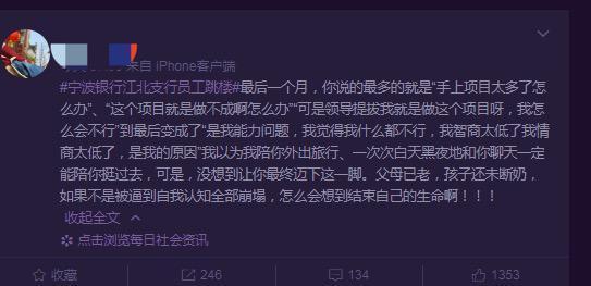 据媒体报道,宁波银行某支行员工吴某于5月6日中午12点30分左右从自家居住的小区跳楼身亡。此事件经媒体报道之后正处于发酵高潮,引发全社会广泛关注和热议。