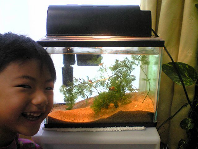 苦的是青鳉鱼。当终于因为缺氧而致使其中一条去了极乐世界后,善良(?)的妞妞大哭着守在鱼缸旁。