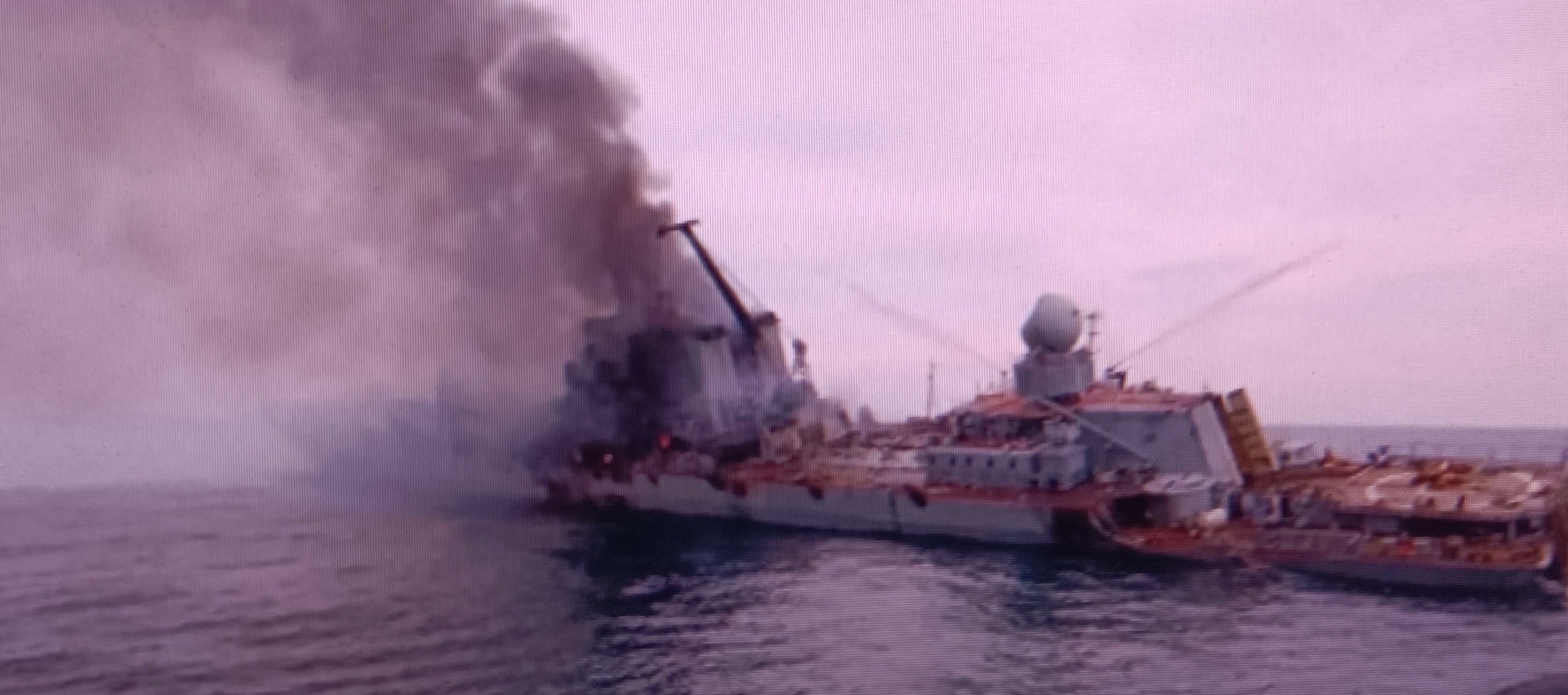 俄国黑海舰队旗舰莫斯科号导弹巡洋舰中弹起火