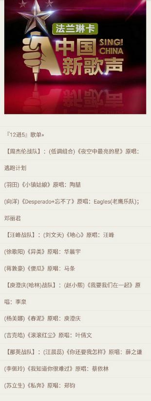 不过,根据知名爆料人@不是我干的嘿嘿嘿,最终的全国六强分别是:1.向洋、2.汪晨蕊、3.徐歌阳、4.蒋敦豪、5.李佩玲、6.杨美娜。 此前呼声极高的“地表最强战队”的“低调组合”和那英战队的苏立生惨遭淘汰。此外,12强选手的歌单也随之提前曝光!