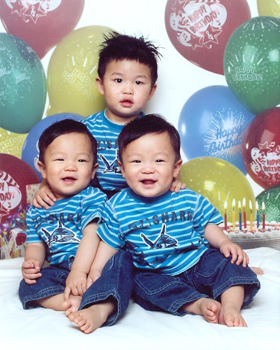 双宝一岁生日时,三兄弟的合影。26个月的哥哥和12个月的异卵双胞胎弟弟。